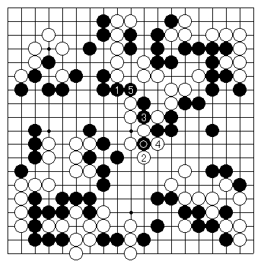 先ほどの実戦の続きです。私は、上辺の下辺の石を絡むことばかり考えていて、失敗してしまいました。何とか、上の白石を取りにいっている局面ですが、ここで白から決め手があります。白はどうするでしょうか?