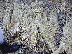 はや鏡開きもすぎ、小正月もすぎ。「今頃になって、注連縄作りのお話をしようってぇのは、何故なんだい」と、お聞きになってくださるな…昨年暮れ間際、私の住む地区がお宮の注連縄作りの当番で、2日にわたって地区総出で作り上げた。1日めは私が出席。初めての注連縄作りに、心浮き浮き、私になんか作れるのかなと不安も少々で参加した。地区の古老が丁寧に藁縄作り、縛り方などから指導してくれた。この知識を、地区の若手が引き継がねばならないと、みんな必死に頭と手で覚え込む。今でこそ、小学校や中学校でも注連縄(ごぼう注連)作りを取り入れているが、私なんかは、初めての初めて。でも、初めては初めてなりに、下手は下手なり楽しかったのだ、実は。これは稲藁。グダグダしてますね。このグダグダ藁を足などにたたきつけて根性を入れ直すと、こんなにスッキリとした藁になります。さて、恥ずかしながら、私の編んだ細縄です。あっあー、そんなにしっかり見なくてよろしいッ!手の平に唾ならぬ水をつけてよるんですよ。結構力がいるし、手の平も手の甲も、皮膚は大荒れ。お肌には良くないですよ~。これは、私の作った「ごぼう注連」。あっあー、これも、そんなにしっかり見なくてよろしいッ!苦労したのに、検閲により廃棄されました。トホホホホ検閲を通った「ごぼう注連」には松が付けられます。このとき、結わえるのが先程の細縄で、「大内締」とかいう縛り方。この方法だと弛んだりしないのだそうです。この作業は女性陣。私もちゃんと結わえることができましたぞ。この注連縄は柱や玄関などに飾ります。これは特大注連縄。男性陣が数人掛かりで、汗を流しながら締めました。長さは10メートルくらい、太さは20センチくらいだったかな。そんな姿を側で見ていて、伝統を受け継ぐ大変さも感じました。翌日、鳥居に飾られた特大注連縄。立派でしょ。これは今年また、別の地区の人達が新しいものを作って交換するまで飾られています。地区の古老が言いました。「藁っていうのは、縄になったり、注連縄にもなるし、草鞋にもなる。蓑にもなるし、最後は畑の肥料にもなる。全く無駄のないものさえ」藁文化ですねえ。私の大切な樹木も、この藁に囲まれて寒さに耐えておりまする。