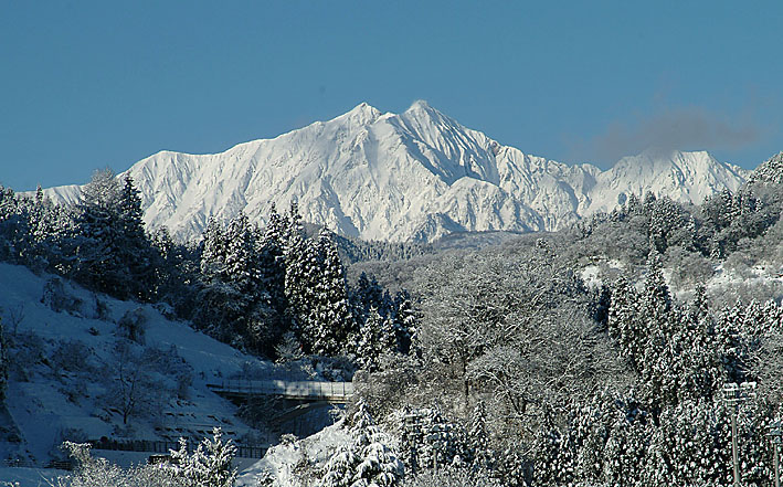 いやあ、昨日はすごい降りで、夜半にはやみましたが、胸がスッとするような降りっぷりでした。やっと冬が来たって感じです。最も積雪はここ3日で20センチくらいだから大したことはないのですが。1シーズンの降雪量は大体同じという持論(?)なので、いつ降るか、どか雪になるんじゃないかと、ずーっと心配ではありました。雪かきは嫌でも、来るべきものが来ないと春も来ないじゃないですか…そうでしょ。で、今朝の鹿島槍はこんなでした。
