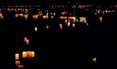 ★更新2回目★送り火の鳥居形を見に、広沢池へ行ってきました。池には五色の灯篭が流されていて、とても美しい光景です。児神社で灯篭の受付が行われ回向(塔婆施餓鬼供養)の後に池に浮かべられます。ご詠歌が池中に響き渡り厳かな雰囲気です。東日本大震災慰霊灯。池にはボートがたくさん出ています。昨年ボートに乗ってとても感動したので今年も!と、思っていたのですがボートは全部出てしまっていて乗れませんでした、残念20時20分に点火が始まりました。五山の中で鳥居は一番最後になります。シャッター押す瞬間隣の人にぶつかり、ブレたけどなんだか芸術的?点火から数分後、鳥居が浮かび上がりました。いやー、しかし暑かった~