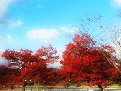 ■2013-11-28 NO.2■紅葉を見に嵐山方面へ行ってきました今日は平日だから先日の週末と比べたら人出もマシかな?とか思ってたら甘かった~シーズン真っ盛りなのでどこもすごい人でした。一昨年行った厭離庵の前を通り過ぎ祇王寺へ。拝観料300円で良心的な値段だわ~と思ったら、とてもこじんまりとした敷地であっという間に見終わってしまったので低価格なのも納得。それに紅葉の色がいまいち鮮やかさに欠けたので夏の青々と苔むした季節に行くべきかも。今年も厭離庵行けば良かったかなぁ。その辺の公園の紅葉の方がキレイだったり夕方になって少し人口密度が落ち着いた渡月橋。川沿いで焼きそば休憩の夫。ちなみにベンチが新品そういえば前のベンチは台風で流されたんだっけ。
