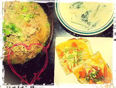 大根と豚肉のみぞれ煮、ほうれん草とエリンギの豆乳スープ