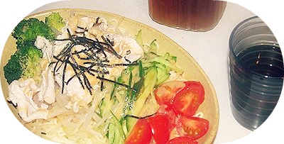 具材は、茹でた豚肉、もやし、きゅうり、ブロッコリー、プチトマト♪