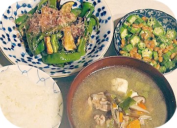 豚汁 オクラ納豆 茄子と万願寺とうがらしの焼き浸し