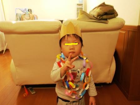 昨日はへろへろだったユウマさん 今日は薬が効いたのかだいぶ元気になってました。 バーバがユウマに王冠と首飾りを作ってくれて最初は嫌がったユウマ でも「王様になって写真とろっか」というと 写真好きのユウマさんは急いで王様に変身 ユウパパのカメラのタイミングが悪くて真顔ですが 本人はノリノリです。 寝る直前まで王様になってました。 体調が良くなってよかったねユウマ