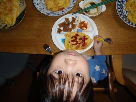 3年前の今日ユウマはユウパパのところに生まれてくれました。 最初に抱っこした手が震えていたのを今でも覚えています。 ってなわけで今日は誕生日 まずは晩御飯オムライス(文字入り) 食べた後はケーキ登場今年はドナルドダックです。 さて今日のメインイベントです。 キャンドルの火を消してもらいましょう。 ふー(ユウマ) なかなか消えないねー 近づいて フー!!(ユウマ) なかなか消えないねー さらに近づいて 「熱い!!」(ユウマ 唇に 5のダメージ) 近づきすぎですユウマさん 3歳になっても我が家に笑いを提供してくれます。 これからの3歳イヤーもよろしくお願いします。