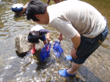 ちょっと前ですが川魚のあまごをとってきました。 っと言ってもユウパパは釣りはしません。 どうやって捕ったかというと 手あみで捕ってきました。 これだけ聞けば 「ウン野生児」 みたいですが そんな所があるんです。 こんな感じ 浅い池のようなところがあってそこにあまごを何匹か放してもらいます。 それを網で捕まえる そして料理してもらって食べる。 そんなところです。 ジージと頑張るユウマ 料理を待つユウマ 料理その1 あまごの塩焼き 料理その2 あまごのから揚げ どっちもユウマは人一倍食べてました。 なかなか生きている魚を触ることがないので良い経験になったと思います。 しかし5月の川の水は冷たかった