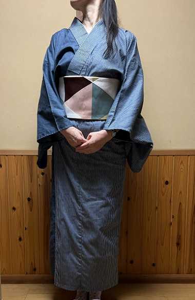 袖なしの綿麻無地紺しじら浴衣にパンダ腰紐 2025.06.20