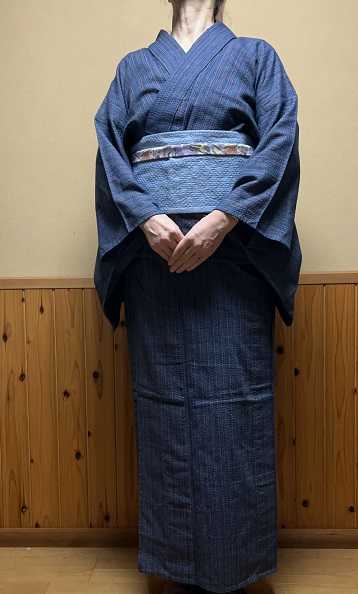 袖なしの綿麻無地紺しじら浴衣にパンダ腰紐 2025.06.20