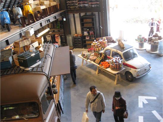 中のギフトショップはロンドンバスをシンボルに、シトロエン・Hトラックやフィアット500が展示