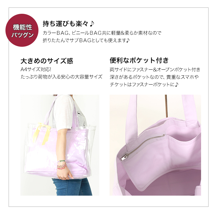 【ネットショップ】http://www.no1boy.com/shop/index.html 本日は楽天の【リアルタイム総合ランキング 部門6月4日(木】 1位商品のご紹介です。 アレンジ自在!カラーバッグin透明バッグ キャンバス A4 トート 価格1,842円 (税込 1,990 円) 送料別 《サマーバーゲン》6/4リアルタイム総合ランキング1位【カラーバッグ&ビニールバッグ2点SET】ビニール バッグ BAG キャンバス A4 トート 透明 2WAY ビーチ プールバッグ