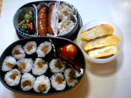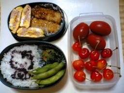 おにぎりを持ってデジカメを買いに主人と次女が出かけた。日替わり商品を買いたいので日曜日なのに6時に起きて出かけた開店まで2時間半以上並ばないといけないので、マットとおにぎり、お茶、本を持っていった。遠足みたいだ 7時頃娘からメールが来て もう3人並んでいる という。15分くらい後に もう9人になった というメールが来た。限定10台なのであと1人だ。ラッキーさんは誰だ??日替わり商品はかなり早く行かないとダメなことがよくわかった。 長女は今日も部活 今日はサッパリめのお弁当 まぐろしょうゆ漬 たまごやき 小松菜のお浸し 大学芋 ミニトマト 白米(梅干) こんにゃくゼリー(りんご味) *デラウェアはやはり食べるのが面倒だって。