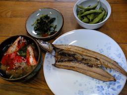 今日はお弁当はなかった。先生が成績をつける日だそうで、お休みだから。でも、部活のために朝から出かけて行った。お昼は、途中で買うらしい。たまにはいいよね、お互いにお盆です。お墓参りに行った。以前すご~く混んでいてバケツもシシャクも無かったことがあったので、今日は早めに行ってきた。それなりに混んではいたがバケツもシシャクもあった。こちらのお盆は、お墓参りに行って、親戚の家にお線香をあげに行くくらいかな。学校もまだ休みにはなっていないからね。花屋さんは朝早くから開いている。仏壇用の花やほおずき、はすの花などが並んでいる。和菓子屋さんもお供え物を買う人でいっぱいだ。スーパーもお盆用にといって、天ぷら材料や、煮物用野菜が売られている。街中がガサガサした感じだ。うちも今晩は天ぷらと煮物かと言うとそうではないぶりの照り焼き まつたけご飯 を予定している。もしかしたら伯母がお線香をあげに来る時に、煮物を持ってきてくれるかもしれない夕べのおかず 秋刀魚の開き チャーシュー ほうれん草胡麻和え 枝豆 鉄砲汁 白米 デラウェアチャーシューは、オレンジぶれっどさんの日記でピグさんのレシピが紹介されていたので作ってみた。そばについてずっと見張っていなくてもできるので楽だ。