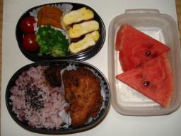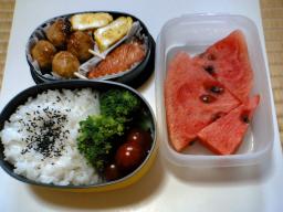 講習&部活の為お弁当。今日はすんなり詰められたつくねのように串に刺さったものって詰めにくい串の下の部分が空いてしまったり、蓋が閉められなかったり・・・それが今日は串の下に鮭がぴったりおまけにスイカまでパズルのように入った。 何かいいことありそう つくね 鮭 たまごやき ブロッコリー ミニトマト 白米(ごま塩) スイカ このスイカ頂き物なんだけど・・・ 切ったら皮が薄い!! 普通に食べても皮がベロベロ