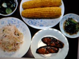 ぶりの生姜しょうゆみりん漬け 焼きビーフン 小松菜のおひたしシラス入り とうもろこし つけもの(きゅうり、なす) 味噌汁(大根、油揚げ) 白米ぶりはお店で見たより小さかったので一人2切れに生協・パルシステムで購入しておいたビーフンを急遽登場させた。チンするだけなのでこういう時便利とうもろこしは2本で1人分ではありません。