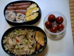 今日は娘の個人面談が9時からあったので、朝から出かけた。うちは学校までわりと近いので9時からでもいいけど、遠い人は大変だ。一番初めの人は8時半から始まるので、それもまただ。ということで、部活に行く娘より早く家を出た。娘も去年までは先輩より早く登校して、楽器のセッティングをしたりしていたが、今年は3年生なので後輩がやってくれる。石の上にも三年とはよく言ったものだ子供が大きくなると学校に行く機会がめっきり少なくなるので、子供の教室がわからない親も結構いる先生は「1年生は下です!」など案内をしているし、私も教室を聞かれたが、自分の子の教室しかわからないので、ゴメンナサイだった入校証を首から提げたまま帰った人もいたようだいつ気づいたのだろう電車の中? しゅうまい ハム たまごやき 大学芋 ミニトマト 炊き込みご飯