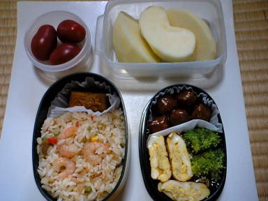 今日は久しぶりのお弁当。この何日かは顧問の先生が行事でいらっしゃらなかったりで、部活はお休み。午前中だけの講習だったのでお弁当はなかった。その講習は午前中3時間で、外人の先生がいらして英語しか喋っちゃダメというもの。もちろん友達同士も英語のみ。講習最終日の夜は英語で夢を見ましょうというのが最初の目標 えび竜田揚げ たまごやき きんぴらごぼう ミニトマト ピラフ 梨もう梨が出てきた梨はお弁当に持たせやすい野菜や果物って季節を感じる