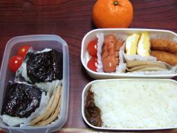 今日も娘は朝練です。朝ごはんを食べていると友達からメールが ”まだ真っ暗だねぇ 地下にもぐっちゃったから日の出が見れない~”わ~!もう電車乗ってるんだ~!! この時まだ娘はパジャマどこのクラスも朝練頑張ってるね~もうじき本番頑張れ~打ち上げの準備も着実に進んでいるようだ 娘の好きな”カリカリ梅とゆかり”のおにぎり。 私は梅を刻むのが面倒 もうひとつは昆布入り。昆布がはみ出してるよ 海苔が無いから隠せない。