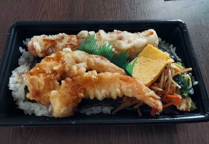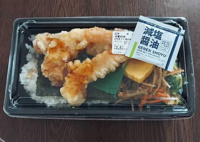 いつもののり弁当の白身魚フライの代わりにタレのかかった海老天が乗ってるって感じ。