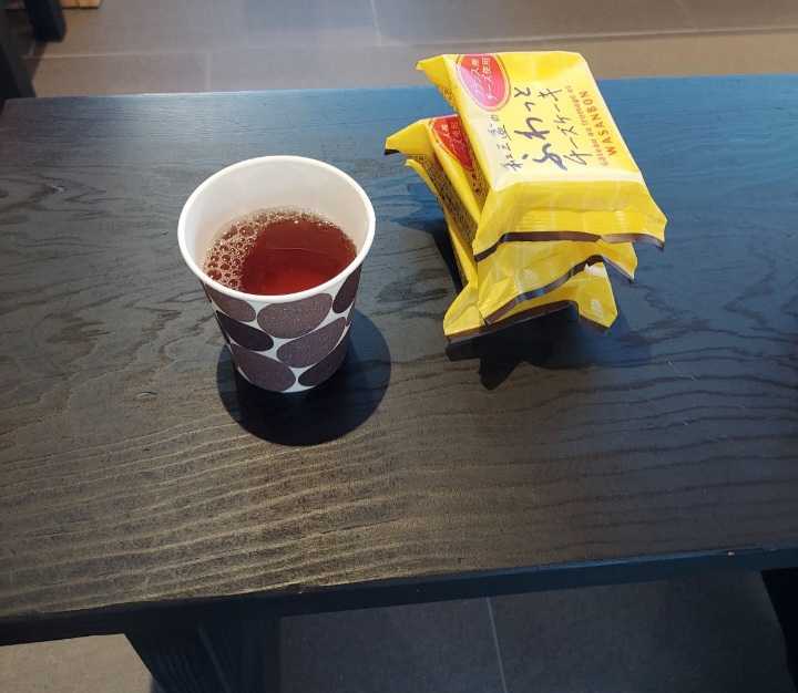 店内で飲食できるとのことで、ほうじ茶を頂いた。