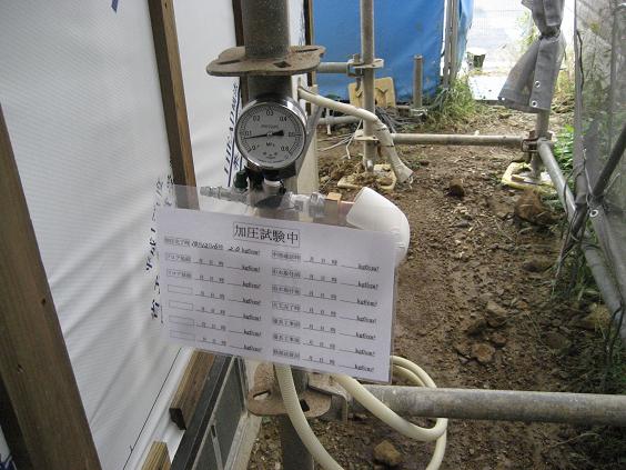 囲いから入ることができたので、建物の周りを歩いてみたら、どなたかのやはりブログで見た加圧試験中のメーターが在りました。床暖房の管の試験するためのものでしょうか?ブログには数値が0になるとどこかに亀裂が生じてしまっているのだとか書いてありますが?今度質問してみたいと思います。