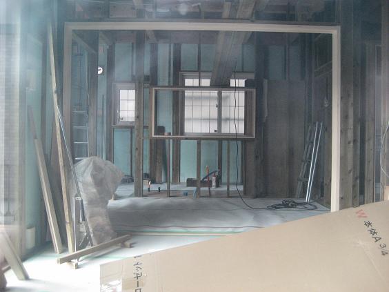 サッシの窓から中を覗いてみると、窓の枠や、対面キッチンの枠などが入っているのが見えました。フローリングもすでにされ、しっかりと養生されているようでした。