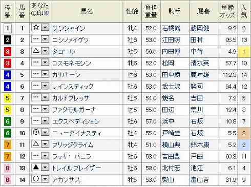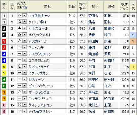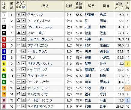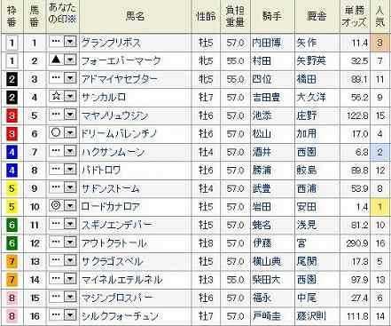 中山11R オールカマー GII芝2200m 発走15:453歳上オープン (国際) (指定) 別定 16頭 ◎ 15 ダイワファルコン中山巧者でポン掛けする。外枠からどう捌くかがポイントだが。 〇 9 ダノンバラード宝塚記念は直前の雨が功を奏し2着に健闘した。この条件のGIIをすでに勝っているので、状態さえ良ければ勝ち負けできるでしょう。 ▲ 3 ハナズゴールスムーズなら牝馬らしい切れる馬なので、1400m~マイルがベスト条件か。距離は相当長そうだが、やはりこの決め手は脅威。 ☆ 2 サトノアポロポン掛けするので巻き返しに警戒。 ヒモ△は 1 マイネルキッツ10歳と高齢だがこのメンバーなら3着はと思わせる。しかし距離が短いだろう。 4 メイショウナルト去勢しセン馬になってから馬が変わった。落ち着きが出たのだろうか。上昇一途なので相手強化も通用の余地はある。 5 ムスカテールこのメンバーではもう少し距離がほしい。GIIならこの一連の成績は上位だが。 13 オーシャンブルー有馬記念2着の実績なのでもっと重い印が妥当だが、どうも本来の調子にはほど遠いようだ。取捨に悩む。ムラ掛けタイプでもあるし今回は底力でといったところか。 買い目 本線 3連複 BOX (2.3.9.15) 押さえ 3連複 (9.15)1.4.5.13(3.15)1.4.5.13(3.9)1.4.5.13(2.15)1.4.5.13 ぽちっとよろしくねにほんブログ村にほんブログ村