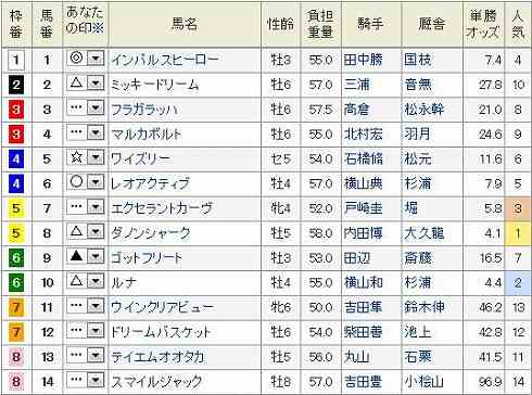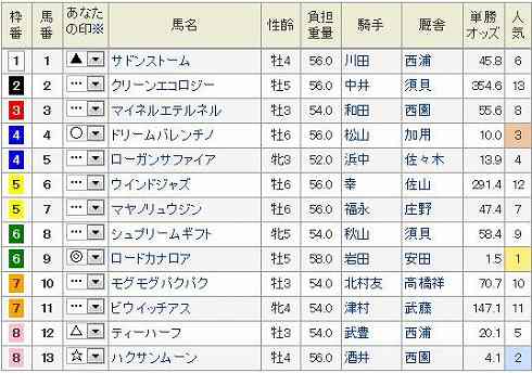 阪神11R セントウルS GII 芝1200m 発走15:353歳上オープン (国際) (指定) 別定 13頭 皆さんおはようございます 朝からうれしいニュースが飛び込んできた。というよりこのために休みなのに5時に目覚ましセットし、朗報を待ちわびてました。そうです 2020年 東京オリンピック・パラリンピック開催決定 死ぬまでに一度は日本で観たかったオリンピック。7年後の楽しみができた。サッカー観たいね。バレーボール観たいね。水泳も観たいね。必ず見に行くぞ スポーツしてる子供達も現役選手たちにもいい目標ができて日本のスポーツのレベルがさらに上がるんじゃないかな 金メダル獲って日の丸掲げよう。 さて競馬です。 王者登場で配当的には期待薄だが、どんな前哨戦を迎えるか楽しみな一戦。 ◎ 9 ロードカナロア海外含めGI4連勝中と文句のつけようがない。マイルも制し、もはやタイキシャトル級だろう。次への叩き台になるが不安材料もなく、アクシデント以外に飛ぶ要素がない。 〇 4 ドリームバレンチノ前走函館SSは59kgが堪え7着でしたが、勝ち馬から0.2秒差と僅差。56kgの今回はその穴埋めには十分。阪神は3年ぶりだが、当時とは馬が違う。 ▲ 1 サドンストーム北九州記念は1番人気ながら10着と大敗。この馬には時計が速過ぎた。開幕週で出番なさそうだが、小雨が降って適度に湿っているので、時計が少しでも掛かるのは却って好材料になりそう。 ☆ 13 ハクサンムーンスピード上位で単騎濃厚だが、極端な成績の傾向が強いので人気の時は買いたくないが・・・ △ 12 ティーハーフ 1200mなら強烈な末脚を使うが、休み明けと初の古馬相手でどうか。速い逃げ馬もいるので、ここでもやれそうだが、あくまで展開待ち。 買い目 本線 3連複 BOX (1.4.9.13) 押さえ 3連複 2頭軸 (9.12)1.4.13 ぽちっとよろしくねにほんブログ村にほんブログ村
