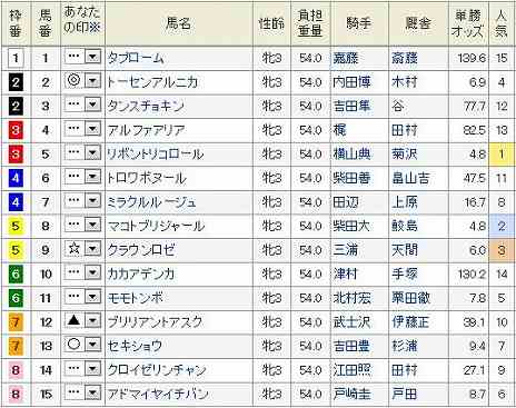 中山11R 紫苑S 芝2000m 発走15:453歳オープン 混 牝馬 (指定) 馬齢 15頭 おはようございます イヤダイヤダ合わないな・・・ 割り切ろう 今日は重賞こそないが、秋競馬が始まり秋華賞トライアル。 クラウンロゼを除いて全て条件馬。レースにも低レベルはある。でもどれかが勝つんだよな。本番には一切、連動しないと思うけど。 ◎ 2 トーセンアルニカ2000mで崩れず連勝中と勢いに乗っている。広い馬場向きのような気がするが、好枠を引き、権利獲りしそう。 〇 13 セキショウベスト条件だが、外枠は誤算。巧く内に潜り込めるかが鍵になりそう。 ▲ 12 ブリリアントアスクあまり成長は感じないが、この馬どこかで大掛けしそうなのだが。春よりもメンバー弱化で中山なら一発あるかも。 ☆ 9 クラウンロゼ唯一のOPと重賞勝ち馬だが、桜花賞、オークスと全くいいとこなく大敗し、リズムを崩したのか体調の問題なのか原因がよく分からない。休養し立て直し効果もあるだろうから改めて。 ヒモ穴△はやはり内枠からか 3 タンスチョキン 掴みきれないが4 アルファアリア 小柄でいきなり動けそう5 リボントリコロール 末脚は確実で8 マコトブリジャール スムーズに先行なら 買い目 本線 3連複 BOX (2.9.12.13) 押さえ 3連複 (2.13)3.4.5.8(2.12)3.4.5.8(2.9)3.4.5.8 ぽちっとよろしくねにほんブログ村にほんブログ村