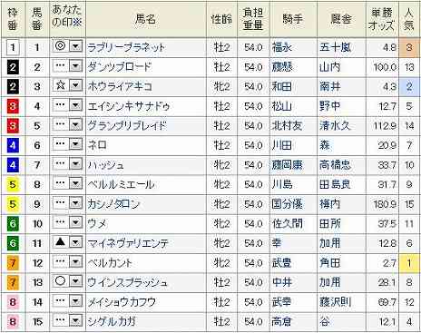 小倉11R 小倉2歳S GIII 芝1200m 発走15:352歳オープン (国際) (特指) 馬齢 15頭 皆さんこんにちは 夏の小倉開催も最終日。 雨に見舞われ馬場の内側は荒れてきているが、差し有利になるかどうかは微妙なところ。一長一短なメンバー構成で展開も含め難解です。 新馬戦からは7.27のホウライアキコが勝った組が一番レベルが高かったように感じるが、当時はスピード馬場でここで参考になるかは分かりません。それらの要素を踏まえ他の組とミックスしながら予想しました。 ◎ 1 ラブリープラネット力の要る中京で力強く抜け出した脚はいいものがあった。最内を引いてしまいこれがどうでるか。 〇 13 ウインスプラッシュOP中京2歳で逃げ粘り2着と健闘したが、メンバーレベルが分からない。1400mで残れる持久力があるので、この距離でも対応できるでしょう。 ▲ 11 マイネヴァリエンテ新馬戦では☆ホウライアキコのスピードに屈したが、差しにも回れそうでこの馬場なら逆転も。 ☆ 3 ホウライアキコスピードあり良なら逃げ切り濃厚だが、この馬場で少し減点した。 ヒモ△は手広く 5 グランプリブレイド 揉まれてどうかだが、素質あり一発秘める。 7 ハッシュ良馬場向きのタイプだろうが、道悪こなせれば差し脚脅威に。 12 ベルカント新馬戦は楽逃げ圧勝。同様のレースが出来るかどうかだが、1200mでこの血統は本来の力が分かるまで押さえは必要。 買い目 本線 3連複 BOX (1.3.11.13) 押さえ 3連複 2頭軸 (1.13)5.7.12(1.11)5.7.12(1.3)5.7.12 (10.15)3.11.14.16 ぽちっとよろしくねにほんブログ村にほんブログ村