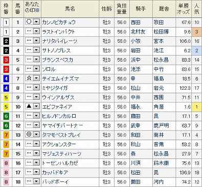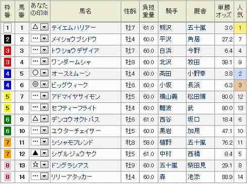 名古屋10R 秋桜賞 SP1ダート1400m 発走16:25 皆さんこんにちは 昨日は豪雨に見舞われラスト2レースが中止になった名古屋競馬。今日は無事開催でほっとひと安心。 ◎ 11 ピッチシフター距離短縮は歓迎。後手に回っても自在性あり力上位。 〇 2 スウィングダンス地元では安定感抜群。今回はベスト距離ではないが、この距離でも先行できるでしょう。 ▲ 5 メビュースラブ距離短縮で巻き返し当然の力。 ☆ 3 トウホクビジン各地の重賞を短い間隔で使い本当にタフな馬だ。時に大掛けするのでメンバー弱化のここは警戒。 △ 10 マンボビーン地元園田重賞でアスカリーブルを下し勢いに乗るが、この距離は少し忙しいかも。 △ 6 ユーセイクインサー地元でこの距離なら変わり身あり。 本線 3連複 BOX (2.3.5.11) 押さえ 3連複 2頭軸 (2.11)6.10(5.11)6.10(3.11)10(2.5)10 ぽちっとよろしくねにほんブログ村