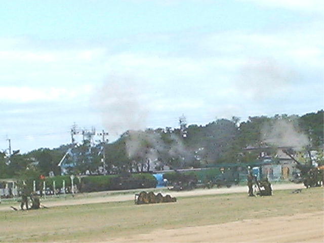 距離にして100m~500m空砲とは言えドッカンバリバリとやるから迫力満点。目の前にヘリが降下してきて降下レンジャー部隊が来たものだからヘリの風が砂ぼこりを巻き上げ開場はホコリまみれ。その後前進してくる戦車の空砲は、爆音で身体が揺れるほどの近距離。周囲を見ていて一番喜んでいたのは、やっぱり男の年配者。子供返る一日の基地祭はお祭りか運動会ということろですね。低空で旋回するヘリの画像を見ても御分かりのように後に見えるが善通寺五重塔ですからコリャ~落ちても可笑しくないよね。この時高度20mを切っていた。