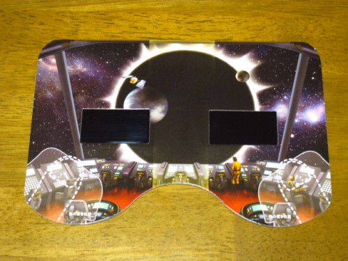 こんばんは。今朝ファミマで日食観測メガネをゲットしました。まあ紙製のチャチなもんですが、十分役目は果たせます。ネットやカメラ屋でメガネ単独で探すと売り切れですが、本のおまけに付いてるのは案外手に入るみたいですね。値段も390円ですので、当日見えなくても懐は痛くありません。でも、やっぱり見えないと寂しい・・・