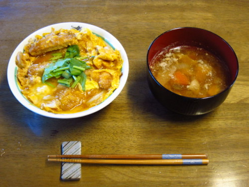 こんばんは。無性にカツ丼が食べたくなり、自分で作りました。豚汁付きです。