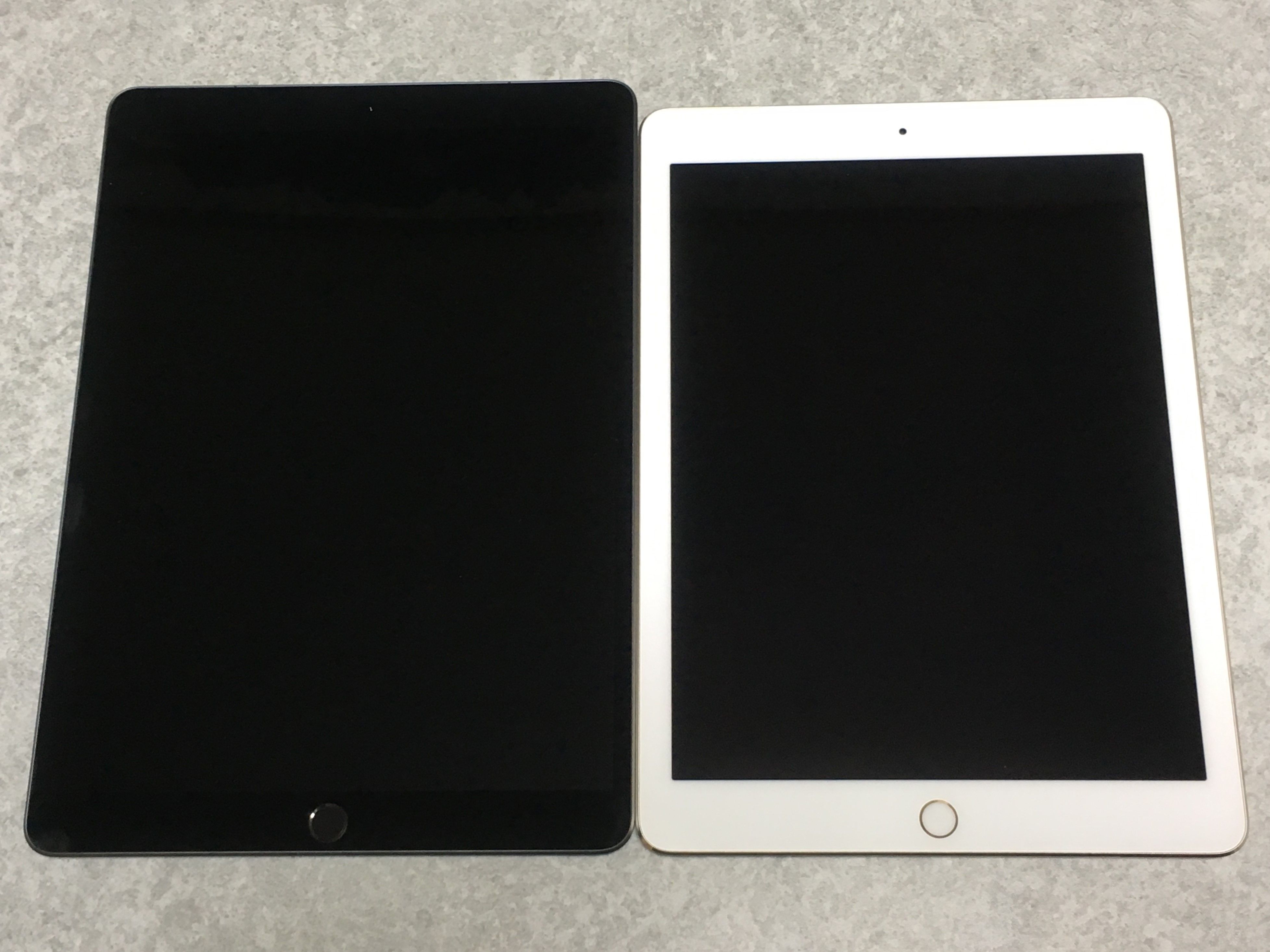 左からiPad Air3(10.5インチ)、iPad Pro(9.7インチ)、iPad mini4(7.9インチ)、iPhoneSE(4インチ)、Air3はスペースグレイで画面が黒いせいか余計に大きく感じます。