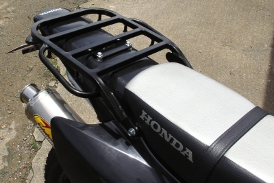 ライディングスポットのリアキャリアーTYPE-2を付けてみた。 鉄の角パイプを使っているので見た目の剛性は頼もしい。 ボルトはニッケルメッキ色に合わせて黒のボルトの方が好ましかった。整備性は低下した。 バッテリーや、シートを外す作業は面倒になりました。 穴の位置は粗く、シノが必要。と、までは言わないがフレームやキャリアー自体に無理な力が架かっています。 もしかしたら、キャリアーが原因でフレームが歪んだり切れたりするかもしれない。 工具入れは付けられません。スペーサーを入れて、高さを合わせればたぶん可能。