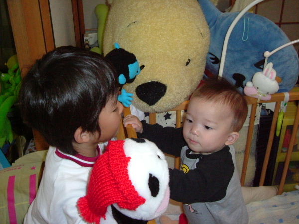 寒い寒いと思ったらやっぱし雨になっちゃったのねん。。。幼稚園から帰ってきてベビーベッドに捕獲されている?チビ斗と遊ぶチビ太♪最近は結構お兄ちゃんらしく?なってきたかな。。?ちょこっとね・・!ぬいぐるみやら玩具やらゴチャゴチャのきちゃない部屋も丸見えナリ...当たった時は嬉しかったけど、いざ、処分するとなると厄介なデカプー..こうなったら旦那とかんちゃが爺さん婆さんになるまでおいとくかなぅ?まさかぁ。。。ニャハハ!さてさて!開催中の1オク、チビ太画伯クイズにはたくさんのご参加を有り難うございますですぅ♪ここまでで。。正解者様1名様いらっしゃいますよぉ~ん♪ちなみに鳥類?も入ってますが本来は飛ばない・・?と思うのですがぁ..詳しい方がいらっしゃって「ぃゃぃゃ!あいつは飛びよるでぇ~!!」て言われちゃうと自信のない話なのですがぁ。。(汗)んでもって中、2種類は正解者様多数♪ 両端が曲者よねん・・?どなたをカンニングしますかなぅ~?????今日は久しぶりに実家に行くけど帰ってきたら正解者様増えてるかな?