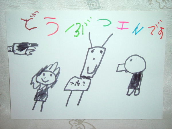 第一問目は「あるある大辞典」でしたぁ♪ 見ても分からんやろう??って思うねんけど何か惹きつけられるものが??あるらすい・・・んで見終わってから必ず!!。。と言ってもいいほど、「ママ!なんでちゃんと見とかへんのん!言うてはったやろ!頑張ったら細くなるねんで!ママは何で頑張らへんのん!カンタン(??)食べやんなアカンやろ!」・・・多分、寒天の回を見てた時なのねん。。。(汗)そこまで見てるなら間違えて覚えるなよぉ~ん。。この間は空を見上げて「凄いなぁ!ジャット機飛んでるで!」・・・息子よ・・そりはジェット機なのよぉ。。。でもまぁつまらん言い間違いをしてるうちが可愛いッス♪さてさて! そりでは第二問♪こちらの画像を御覧下され♪ 先日遠足で動物園に行って来たチビ太画伯がちょこっとお絵かきしてたのを拝借してきました~♪このダウンタウンの浜ちゃんにも負けるとも劣らぬ??力作・・・(汗)画伯は4種類の動物を描いてるらすい?のですが何を描いてるのでしょう?4種類全てセットでお答え下さいませ♪ 答えは既に出てるんですよ~!画伯の腕が問題なだけで...(笑)誤字脱字だらけの文字は堪忍してやってぇ~・・(汗汗)ちゃんと文字を見ながらだったらもうちょっとマシな字が書けるのよん!!一応・・・でも何も見ずに思い出しながらだとこんな有様になってしまうのだぁ。。何で「エ」だけカタカナやねん。。。濁音は全部`が多いし・・どうしても「が」とゴッチャになってしまうみたいでしてぇ。。。(汗)そこは笑って許してやっておくんなましぃ~・・!!こちらは4個セットでの先着正解者様2名様まで粗品進呈♪あとは粗品ゲッチュの2名様含む7名様まで送料無料だよん♪結構分かるかな。。?と思ったりするのは親バカの贔屓目?でせうかぁ..?もうちょっとマシな絵を描くときもあるんやけどねん。。。(汗)そりはまたの機会に載せますじぇぃ。。。