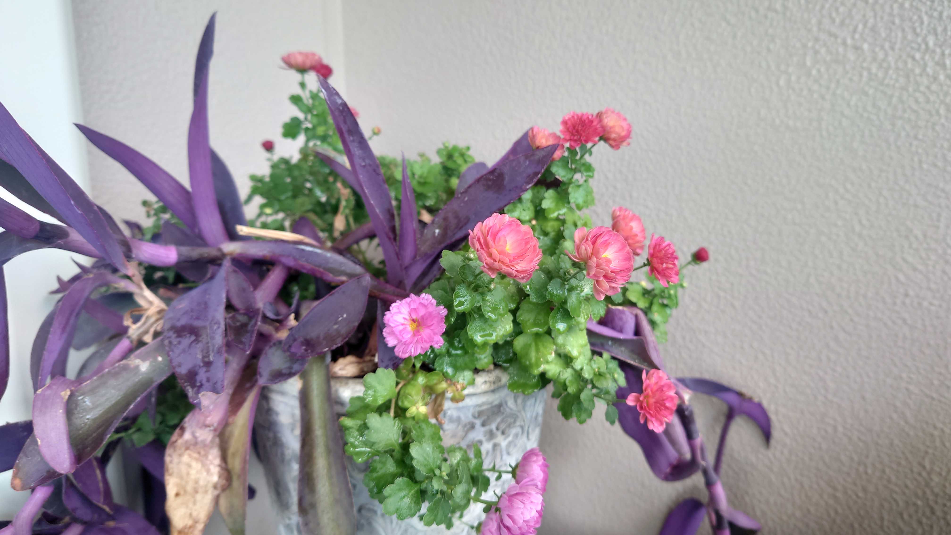 日光に良く当てると深い紫色の葉となり、色々な花々を引き立ててくれます。