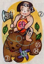 先週の私の答えは合っていたようです。よかったです。1.同じもの探し…10と12(1.金太郎の左の髪の形 2.葉の枚数 3.熊の右前脚の向き 4.腹掛けの文字 5.風車の緑色の部分の有無 6.手綱の余った部分の長さ 7.腹掛けの胸部の空きの有無 8.頭頂の剃り上げの有無 9.斧の金属部分の長さ 11.眼鏡 13.斧の向き 14.熊の左後ろ脚の向き 15.熊の左後ろ脚のつぎはぎの有無※ 4.(確かに今日は土曜日)や11.(某眼鏡店を連想させますが…)のようなボケは嫌いではありません。2.スクエアカット…15┌───────┬─────┬─────┐│8│6│9│││││││││├───────┴─┬───┤││5│2││├───────┬─┴───┼───┬─┤│4│☆│6││├─┬─────┤││││││9│││││││││││6│││││├───┬─┴─────┴───┤│││2│☆6│││├───┴─────┬─────┤│││10││7││││││││││││├─────────┤│││6│5│9││└─┴─────────┴─────┴─┘3.数独…6375189642694732815812456793289563174531974286467821539926318457748695321153247968またえらく難しくしたものです。今までの星5つよりも難易度は高いのではないでしょうか…?