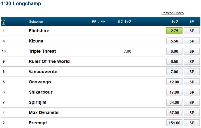 ・スプリンターズS(結果)本命 パドトロワ(14番人気)-15着相手 サクラゴスペル(4番人気)-11着 ドリームバレンチノ(5番人気)-6着ロードカナロア(1番人気)-ハクサンムーン(2番人気)-マヤノリュウジン(15番人気)ロードカナロアはさすがでしたが、フォーエバーマーク(最下位…)を問題にせずに逃げたハクサンムーンも随分と強かったと思います。紛れがあまりなく見ている者に結果を納得させられるすっきりと決まったレースだったと思います。…関係ありませんが、競走成績を見ると15個ある着差のうち9個までが「クビ」…なんだかリストラみたいです…。・WIN5(結果)中山9R(勝浦特別):コウヨウアレス(1番人気) 2.0倍(16頭)阪神10R(道頓堀S):リトルゲルダ(1番人気) 3.2倍(16頭)中山10R(ながつきS):フレイムオブピース(1番人気)-3着:ジェベルムーサ(番人気) 4.5倍(16頭)阪神11R(ポートアイランドS):ヒストリカル(3番人気)-3着:ドリームバスケット(13番人気) 81.5倍(17頭)中山11R(スプリンターズS):パドトロワ(14番人気)-15着:ロードカナロア(1番人気) 1.3倍(16頭)発売票数 7,440,119票 キャリーオーバー 0円 返還票数 0票 的中票数 201票 払戻金 2,731,750円 (単勝転がし 305,130円)・来週[デイリー杯2歳S] 本命候補 (なし)連下候補 アトム オースミチャド穴候補 ピークトラム ライザン大穴候補 ホウライアキコ オトコギマサムネ[毎日王冠]本命候補 ショウナンマイティ連下候補 コディーノ穴候補 クラレント ジャスタウェイ大穴候補 エイシンフラッシュ ダークシャドウ レッドスパーダ[京都大賞典]本命候補 ゴールドシップ連下候補 トーセンラー トゥザグローリー穴候補 アドマイヤラクティ大穴候補 トレイルブレイザー デスペラード ニューダイナスティ・再来週[秋華賞]本命候補 メイショウマンボ連下候補 デニムアンドルビー穴候補 ウインプリメーラ大穴候補 ウリウリ エバーブロッサム シャトーブランシュ セキショウ プリンセスジャック リボントリコロール・凱旋門賞先程調べたところ、ブックメーカーの人気は以下の通りでした。馬名William HillSkyBetbet 365Orfevre3.252.252.5Treve5.54.03.5Novellist7.56.06.0Kizuna8.08.08.0Ruler Of The World13.011.08.0Intello13.010.010.0Flintshire13.012.010.0Al Kazeen15.014.014.0The Fugue15.016.014.0Leading Light21.020.020.0Ocovango21.020.025.0凱旋門賞特集サイトフジテレビ系列で 23:00-23:45 生中継予定とのこと。