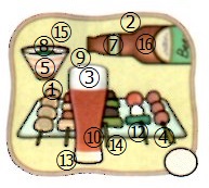 A.同じもの探し…6と11(1.向かって一番左の串の先端の具の有無 2.瓶の傾き 3.ビールの泡の厚さ 4.向かって一番右の串の手前の幅広い部分の有無 5.器の形 7.瓶の首の模様 8.器の中身の有無 9.雫の有無 10.グラスの形 12.向かって右から2本目の串の手前の具濃霧 13.コースターの有無 14.中央の串の手前の部分の長さ 15.器の位置 16.瓶のラベルの形