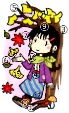 A.同じもの探し…1と11(2.上中央の銀杏の葉の向かって右の葉との前後関係 3.向かって右端上寄りの茶色いささくれの有無 4.ベルトの太さ 5.向かって左上端の枝の長さ 6.右手先の楕円の木の葉の位置 7.上の紅葉の柄の長さ 8.靴外側の縦の柄の太さ 9.女性の頭部にかかる銀杏の葉の有無 10.木の上の根の向き 12.スカートの木の根寄りの柄 13.女性の掌近くの銀杏の葉の位置 14.スカーフの上端の太さ 15.女性の掌の下の銀杏の葉の向き)