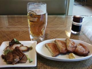 ビールセットビールセット@1000円豚のあぶり焼と辛子れんこん揚げを注文しました。なかなかええ感じですわ♪ひとり飲みも楽しいですね♪(o^_^o)