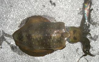 そう言えば、先行組にしたのに出ない2時頃にもしたのに・・・・ AM7:30人気ポイントに到着です、ラッキーな事にだ~れも居ません迷わず堤防先端に陣取ります しかしシャクレどもシャクレども・・・・・満潮潮止まりです墨跡はイッパイありますが・・・ そこに見た事のある釣り人がやってきました~そうです先行していた釣友です 「したのに~」 「家に忘れてきました~」 「・・・・・・・」 ロッドを見ると、先にはワ~ムが付いています 「メバル釣るの」 「ガッシーですよ」 「こんな時間でも釣れるの」 「○秘ポイントっす」 アオリちゃんの反応も無いし~私もガシゲーをする事にしました急いで車からルナキアとワ~ムを取りに行きます・・今日はアオリ1本勝負じゃ~???って野暮な事は言いっこ無しね 早速ガシゲーです1.8gのジグヘッドに2インチのネジワ~ムを装着PE04 リーダー1.2号のメバル仕様です 着低後、底をなめるようにリーリングしてきますと!アタリです・・・しかし乗りません?ワームの尻尾だけが取られてますフグか~? ポイントを少し移動して、ワームを替えてリーリーングするとアタリです結構良い引きでルナキアを曲げてくれました22cmのガッシー君 太陽も出てるのに、筏じゃ~無いのに、アタリがあります楽しいです~ギュンギュンとメッチャルナキアを曲げてくれたのは 27cmのガッシー君です いや~ガシゲーも楽しいね~15cm以下はリリースして4匹だけKEEPしました2匹は弟子1号におすそ分けですあまり釣ってしまうと居なくなってしまいますので、終了 アオリちゃんを求めて移動彼らはさらに南進すると・・・若いです私達は北上して帰り道を稼ぐ事にしました 移動1時間で紀伊長島エリアに到着です、オニギリを食べて私は・・・・一睡もしてないので即気を失いました3時間ほど熟睡です・・・ハゼドン☆さんからので目が覚めました~ 弟子1号は漁港でシャクッて居ましたが・・・・・またまた移動 望みを掛けた漁港でしたが、テトラの工事中で・・・・・もうこの先はありません・・・撤収も考えましたが・・・・ラストエギングですから~南島町エリアまで行く事にしました~ 40分ほどで最初の漁港に到着時間はPM3:30。 速攻でシャクリますが・・・・・相変わらずですまたまた移動 いよいよラストの漁港です、堤防先端には人がイッパイです墨跡もイッパイ話を伺うとケンサキが廻ってきてるって・・・ 私が手にしたのはルナキア○ボ無し記録は更新できてるし、夕マズメに近いし~ココはメバルの実績がある漁港ですんで メバゲーの開始ですまだ明るいので、底狙いです最初に挨拶に来てくれたのは~綺麗なアナハゼ君です ハゼドン☆さんですやん綺麗に着飾ってどないしたんまさか海でオフ会するとは思いませんでした~何か目つきが悪くない(ハゼドン☆さん、勝手に・・・・すみませんm(__)m) その後、アタリはあるものの乗ってきません弟子1号のエギにも・・・堤防の人達にも PM5:00少々疲れてきたので、終了と致しました 走行距離600km一人で走破しました~さすがに疲れましたけどね~楽しかったです 私=アオリ4杯 ガシ多数 ハゼドン☆さん1匹 弟子1号=ケンサキ4杯 ナマコ1匹 読んで頂きましてありがとうございました~♪また遊びにおいで下さいね~♪
