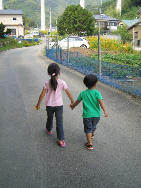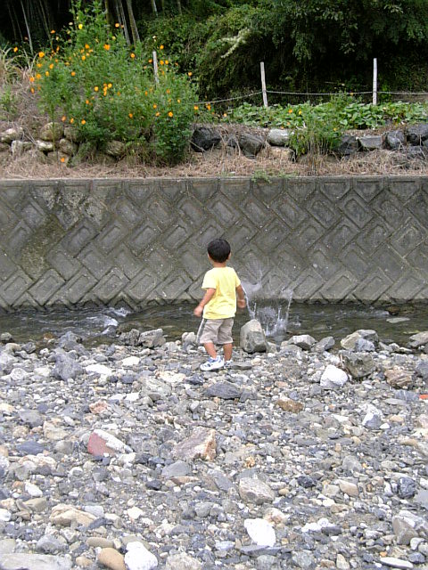 今日は実家にてのんびり・・・・・・・・・・するはずだったのだが・・・・・・・。コウキがあまりにうるさいので、猫を探しに行こうと家の前まで出た。が、猫はおらず・・・・・・仕方ないので近くの川まで行く事になる。これが間違いだった。長旅の始まりである家から30メートルほど行った所で会ってしまった・・・・。一度会ってしまったら コウキがなかなか離れてくれない・・・愛しの彼女・・・・・2つ上の女の子。お昼も食べずに(すぐ帰るつもりだったので)愛しの彼女と会えた事を体全体で喜んでいる。なんともほほえましい・・・・。愛しの彼女あっちゃんは、とても面倒見がよくてかわいいあっちゃんのような娘が欲しいわ・・・そんなあっちゃんが大好きなコウキ。でもコレがなかなか一緒になるとホントに帰らなくなる・・・・。は・・・・腹が減った・・・・ママ帰りたい~~~~もう一人女の子がいたんだけど、この子は別に好きではないようだ・・・3歳児にも好みがあるらしい・・・・・。小さい子って、何てことないものでしばらく遊べる。このコウキが持っているホウズキににている植物でしばらーーーーーーーーーーーーーーーーーーーーく遊んでた・・・。 次は川へ・・・・この時、あっちゃんとちぃちゃんはサンダルを履いていたのでそのままジャブジャブと川へ・・・・。でもコウキはスニーカーだったので、入れずに二人を見てた・・・・そしたら・・・・それに気づいた二人がコウキが靴を濡らさずに向こう側に渡れるよう、石の橋を作ってくれているではないか!!!!ほんとに優しいま、でももう靴のまま川に入っていいよ!!って言ったんだけどね私も入っちゃったやっぱりあっちゃんにくっついてるコウキあっちゃんが何かを持ってる・・・・・あっちゃんいわく・・・トトロの傘~~~~~なるほど!!川遊びが終わってから帰る時に綺麗なお花が・・・・秋だ~~~~~~~~~~~~感動してると、あっちゃんが呼んでる!!なーにーー???ほらほら、見て見てぇーーーー!!トトロの傘売り場~~~~~!!!!なるほど・・・・子供の表現力ってすごい!!! 今日はコウキも楽しそうでした 帰って時計を見ると・・・・ナナナナナナナナ!!!ナント!!!2時間も遊んでた!ご飯も食べずに・・・・・