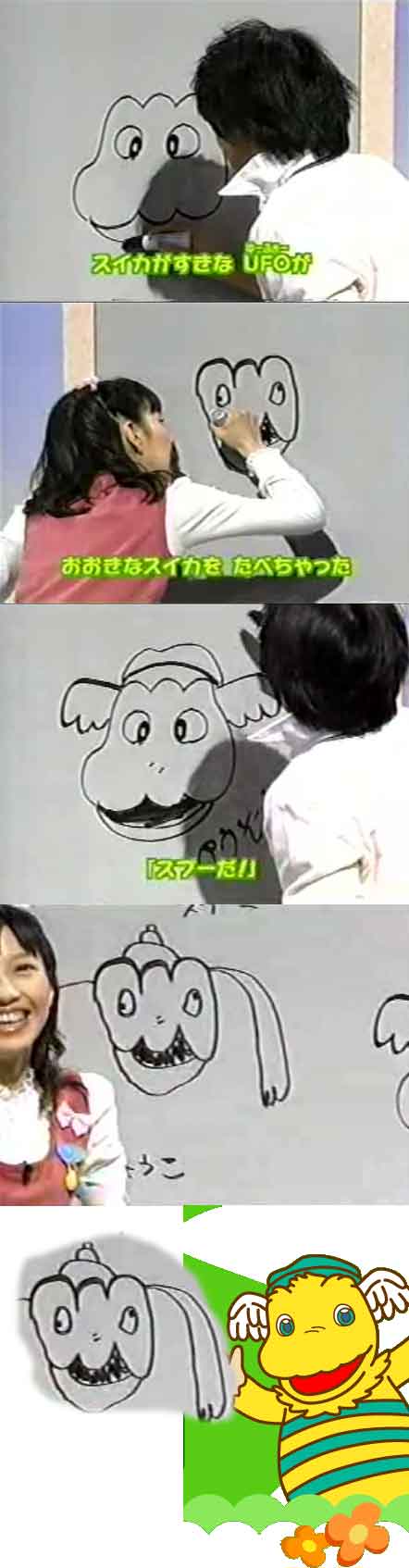 ダメ・・・・今日は朝からショックだわ・・・・。 「おかあさんといっしょ」のお兄さん・お姉さん・・・・・。付き合ってたのね・・・・。まぁそんなことはどうでもいいわ・・・・。ショックなのはしょうこお姉さんが・・・・・!!!!!私と同い年なこと~~~っ!!!!!!お姉さん27歳、お兄さんは29歳らしい。しかもゆうぞうお兄さん、身長170センチで私より低いじゃね~か!! そういえば前に書いたしょうこお姉さんの絵を見つけました!! 続いてはコレ・・・・なんか違う生き物になってる・・・・・こわ・・・皆さん・・・笑い死にしたらごめんなさい・・・。