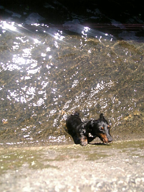 大事件が起きました!!!ティファニーが・・・・ 脱走しました!!! 我が家の一員になって3年近く・・・・一度も逃げた事はありません。 11時半頃、私は何だかウトウトしてきて昼寝でも・・・・・と思っていたところ・・・・。 「すいませ~ん!!!いらっしゃいますか~?」という、男性の声・・・。出るのがダルイ・・・・と思い居留守でも・・・・なんてやつ・・・と企んでいたが、何やらうちの庭の方をキョロキョロ見ている何だろう?と思い、仕方なく出てみる・・・。「・・・・はーい・・・・??」「黒い犬、こちらのワンちゃんですか??」「そうですけど・・・・・?」「道路で敷かれそうになってましたよ!!!北の方に逃げていきました!!」「エェ~ッ!?!?」ご親切に うちのティファニーが道路でロイロイしているのを見つけてわざわざ教えてくれたご夫婦??30代半ばのご夫婦だと思うんだけど・・・ありがとうございます!!!! お礼を言ってティファニーを追っかけたんだけど ・・・・・・・・いない・・・・・ ・・・・・・サァーーーーーーッ(血の気の引く音) それから死に物狂いで捜しましたよ!!!! うちの北側は東京ドームが1.5~2個は入りそうな畑この広い広い畑の中を捜すのか・・・・と、倒れそうになる・・・・・。 しかも今日、暑いッ!!コンチキショ~~!!! 30分は捜しただろうか???「ティファニー!!!」と呼んで歩きまわっていると・・・・50メートルほど向こうに黒い物体が・・・・・!!!!!! 「いたっ!!!!待てゴルァッ!!」 追っかけたものの、逃げられてしまった・・・。旦那に電話して報告・・・。「ゆっくり捜しや~」とのこと・・・・・こっちはそれどころではない・・・ と、電話中にまたもや黒い物体が!!こんどこそ!!と、思った瞬間・・・・・ティファちゃんったら・・・ 全速力で逃げやがった!!!しかも人の顔みるなり・・・ 「ゴルァ待てゴルァ待て!!!!」 ガンガン逃げるティファ・・・・・追いかける私・・・・もう10年以上こんな必死に走ったことねぇぞ・・・・・鬼の形相に恐れをなしたかさらに加速する貧弱犬ティファ・・・ ウォ~~~~!!!待たんかいゴルァ!! そしたら・・・・・50メートル先を走るティファが・・・・・ ・・・・・・・消えた・・・・・・・・ドロン 急いでティファの消えたところへ・・・・!!!! なんと・・・・・!!!!!!!! 田んぼの先ににある・・・・・ 用水路に落ちてた!!どうやら草でその先にあった用水路が見えなかったようだ・・・ププそのまま全速力で用水路に落ちた模様・・・・・バカ そしてミニ滝から落ちていくティファを見てしまった・・・・しかもその時のティファの顔・・・・・。「あ~れ~~!!」・・・って顔してた 幸いその用水路は推進10センチくらいだったので溺れずにすんだ・・・。どどどどどどど・・・・ドブネズミか!?!?!?!?しかもこんな時に余裕ぶっこいて記念写真・・・パチリ・・・ 道路に寝転んで手を差し伸べなんとかティファ救出!!!! バカヤロウ~~~!!!!心配させやがってぇ~~!!!!この時期にありえない汗をかいたぜぇ~!!はぁ~~ダイエットダイエット でもほんとに見つかってよかった。大事な家族だもんね