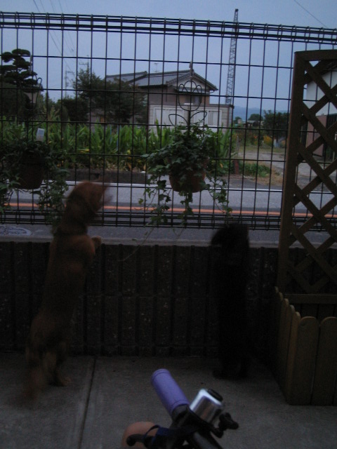 最近頭がおかしくなったのか・・・・??ここでリンの吠える声を「ゴルァ!」と書いていたら最近ホントに「ゴルァ!」と言っているように聞こえる・・・家の敷地全部を使い、北へ南へと全速力で走っている。家の前を歩いて、もしくは自転車で通る人にゴルァゴルァゴルァゴルァ!!と、いいながら南北南北と追っかけているのだ・・・。うるさいうるさい・・・・そんなうるささにも目もくれず・・王子は愛車の点検中・・・。そんな時、愛しのおばちゃん通過・・・・・やーもー、うるさすぎ!! いやー、しかし日が暮れるの早くなったなぁー・・・。6時なのに暗いもの・・・。