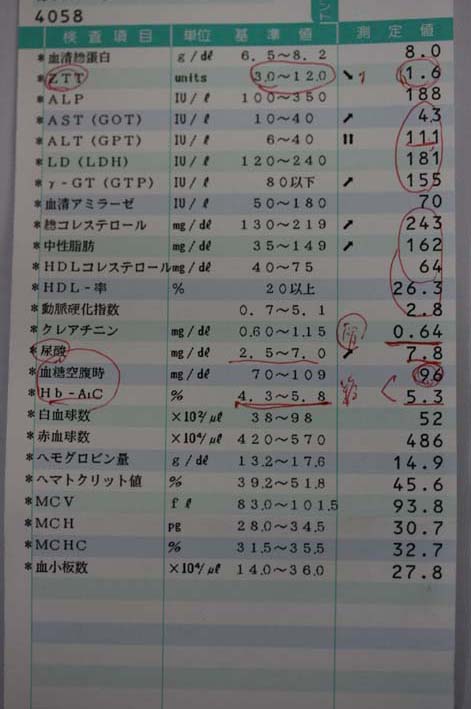 どもども~~メタボリック@店長でございますえ~と少し前の日記でも書きましたが先日、血液検査に行って参りました~ぁ~糖尿とか気になって調べてもらいました。その結果~~~↓(事細かに説明を受けた検査表)なんと正常・・・・笑い但し、肝機能はメタボリックですけどねまぁ、これは仕方ない他の数値が正常だったのでホットしております3ヶ月に1回は血液検査して健康状態を把握しておきたいですね~一度血液検査行ってみよう